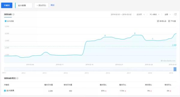 數(shù)據(jù)顯示,多數(shù)消費(fèi)者更喜愛實(shí)木家具。2018年,新浪聯(lián)合居然之家及13家行業(yè)協(xié)會(huì)共同發(fā)布的《2018新中產(chǎn)家居消費(fèi)指數(shù)報(bào)告》中顯示,72%的消費(fèi)者喜愛實(shí)木材質(zhì),其中一部分更偏愛高檔紅木。從百度指數(shù)來看,近30天內(nèi)“實(shí)木家具”的日均搜索量在兩千左右。春節(jié)后每日搜索量甚至達(dá)到三千。